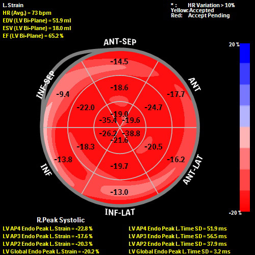 1. Smiseth O., Torp H., Opdahl A., Haugaa K., Urheim S. Myocardial strain imaging: how useful is it in clinical decision making? European Heart Journal, 2015. doi:10.1093/eurheartj/ehv529 2. Caspar T, Samet H, Ohana M, Germain P, El Ghannudi S, Talha S, et al. Longitudinal 2D strain can help diagnose coronary artery disease in patients with suspected non-ST-elevation acute coronary syndrome but apparent normal global and segmental systolic function. Int J Cardiol 2017;236:91–4. Doi: 10.1016/j.ijcard.2017.02.068.