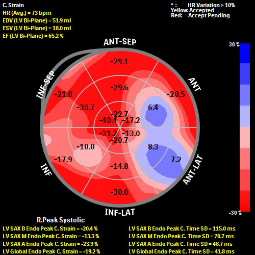 Наиболее вероятной причиной болей и повышения тропонина у пациентки мог быть постлучевой миокардит. Однако, также не исключалось и поражение коронарных артерий с развитием ишемии миокарда. При этом, причиной ишемии могли послужить как лучевое, так и атеросклеротическое поражение коронарных артерий. Было проведено исследование деформации левого желудочка с помощью инструмента autoCMQ, установленного в УЗ аппарате. Оконтуривание областей интереса проводилось в автоматическом режиме. On-cart и auto анализ позволил значительно сократить время исследованияи принятия решения о дальнейшей тактике ведения пациентки.По итогам анализа глобальный продольный стрейн (Global Longitudinal Strain (GLS)) составил -20%, что соответствует нормальным значениям; глобальный циркумференциальный стрейн (Global Circumferential Strain (GСS)) был незначительно снижен 19,2% (норма более 25%). При этом отмечалось снижение локального циркумференциального стрейна в базальных сегментах передней и передне-перегородочной области. Исследование деформации явилось ключевым моментом для дифференциальной диагностики. Снижение глобального циркумференциального стрейна левого желудочка при нормальных значениях глобального продольного стрейна позволили исключить ишемический характер болей у пациентки и подтвердить наличие постлучевого миокардита. Необходимо также отметить что наиболее значимое снижение регионарного циркумференциального стрейна у пациентки произошло в базальных сегментах передней и передне-перегородочной области, что соответствует зоне наиболее уязвимой при лучевой терапии. Было решено воздержаться от проведения коронарной ангиографии. Отмечен полный регресс симптомов и нормализация уровня тропонинов на фоне противовоспалительной терапии.